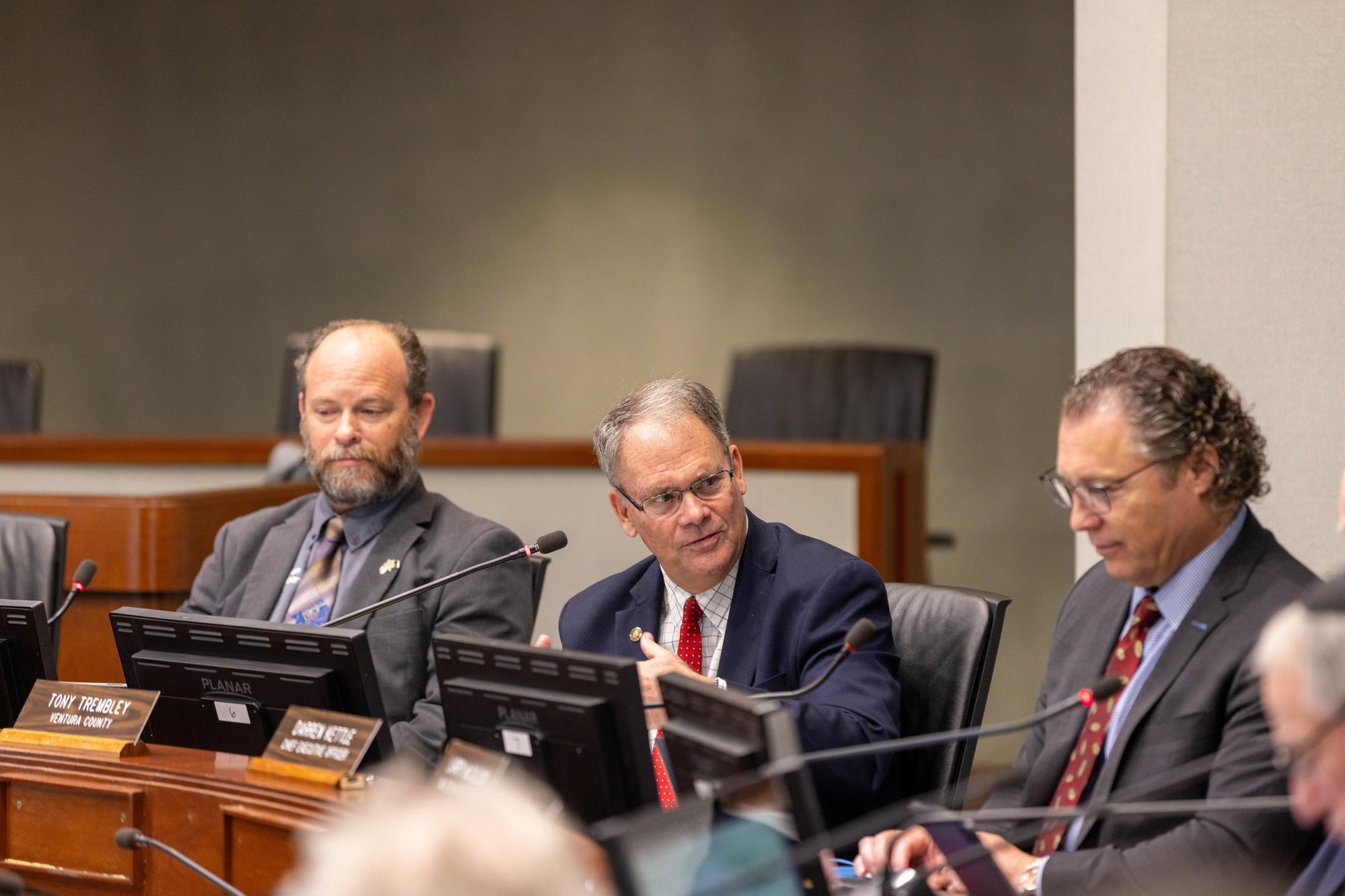 Metrolink Board Second Vice-Chair and Camarillo City Councilmember Tony Trembley (center) takes part in a board meeting with CEO Darren Kettle (right) and Board Vice-Chair and Jurupa Valley Mayor Brian Berkson (left).