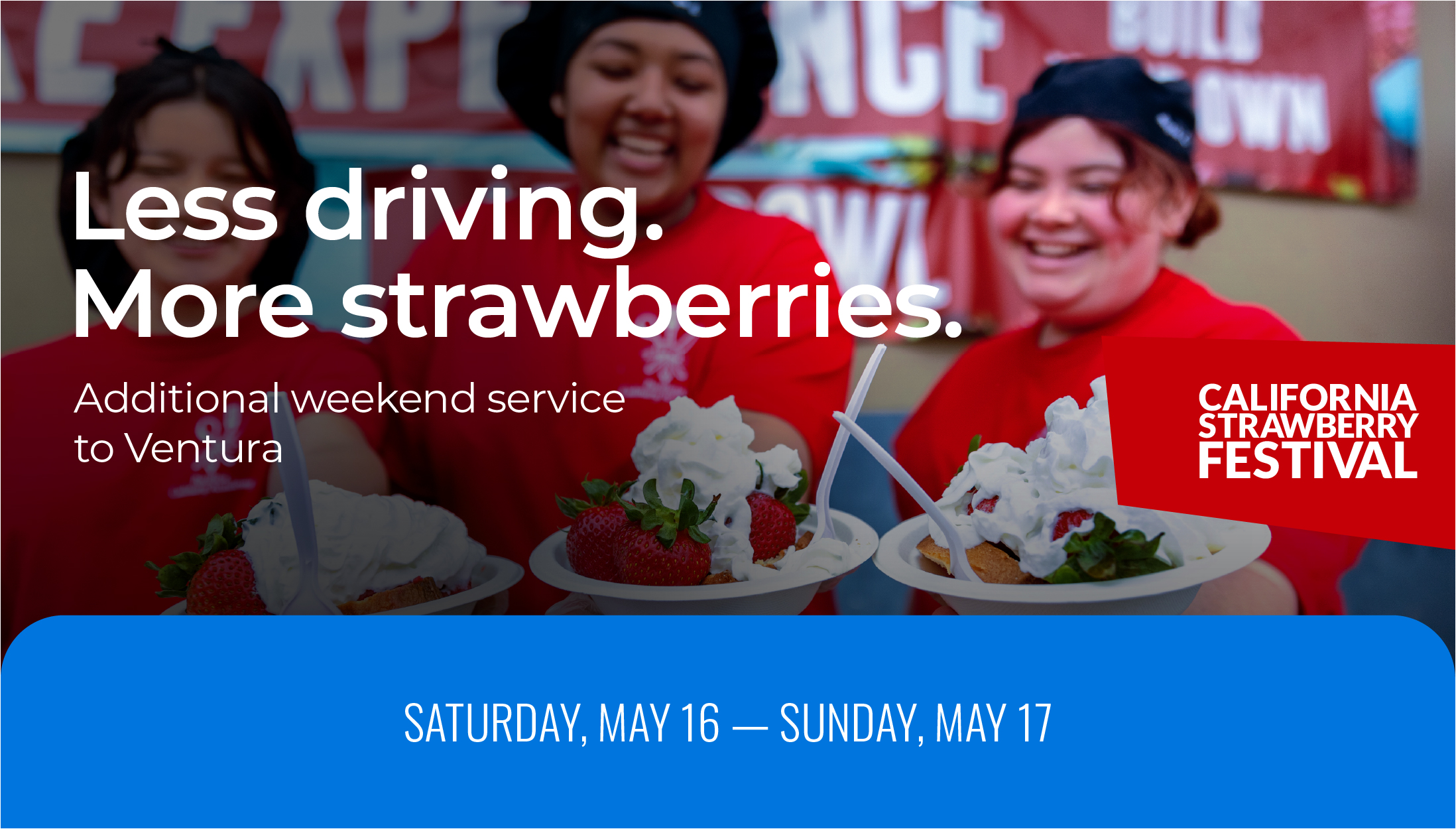 Make your trip to the California Strawberry Festival as sweet and stress-free as the strawberries themselves. Metrolink is offering train service directly to the Ventura County Fairgrounds on Saturday, May 16, and Sunday, May 17, making it easier than ever to join in on the berry-filled fun.