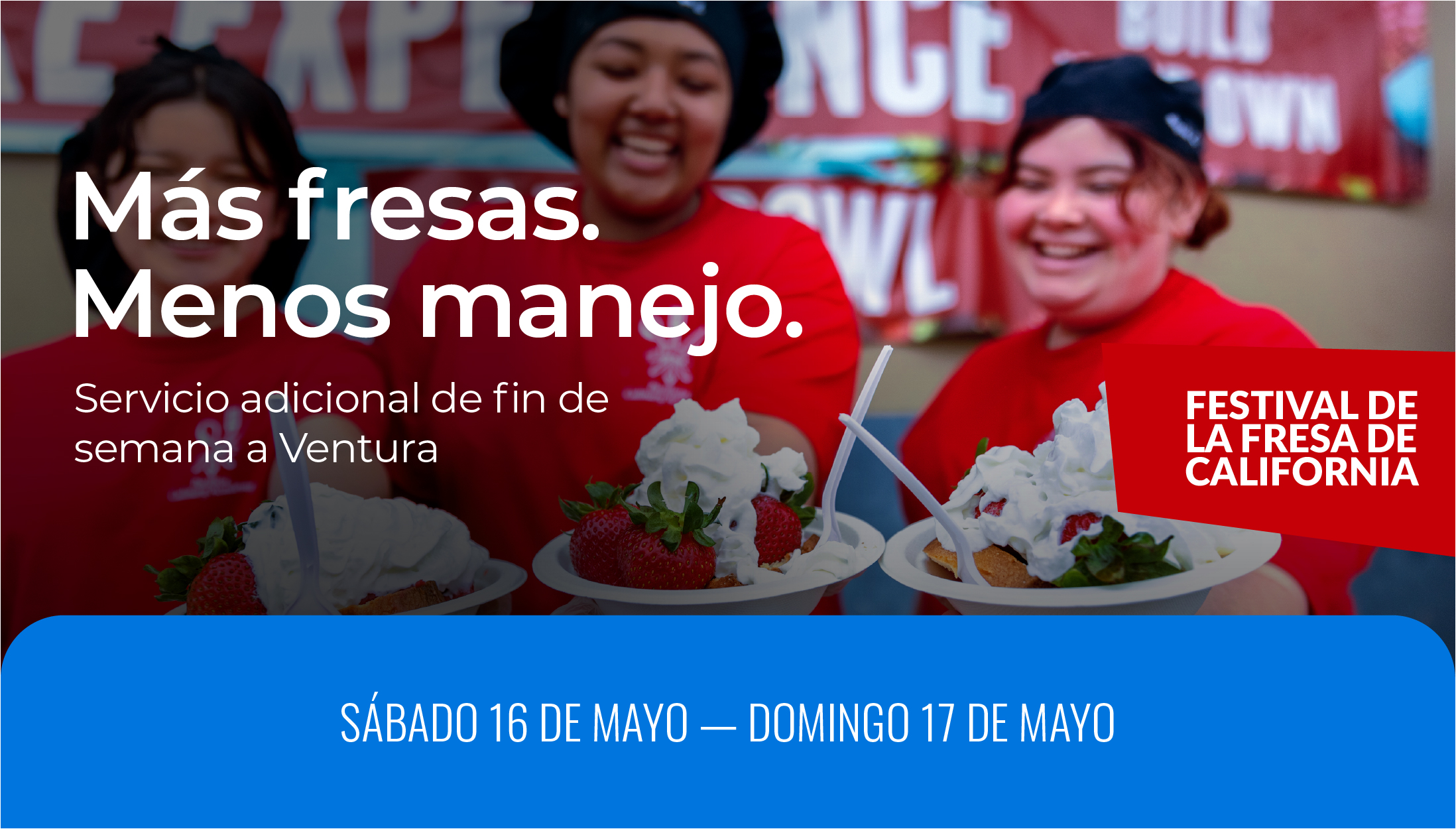 Este servicio especial hacia el California Strawberry Festival solo estará disponible el 17 y 18 de mayo de 2025, pero puede usar el Pase de Fin de Semana de $10 cualquier fin de semana para viajar en Metrolink.